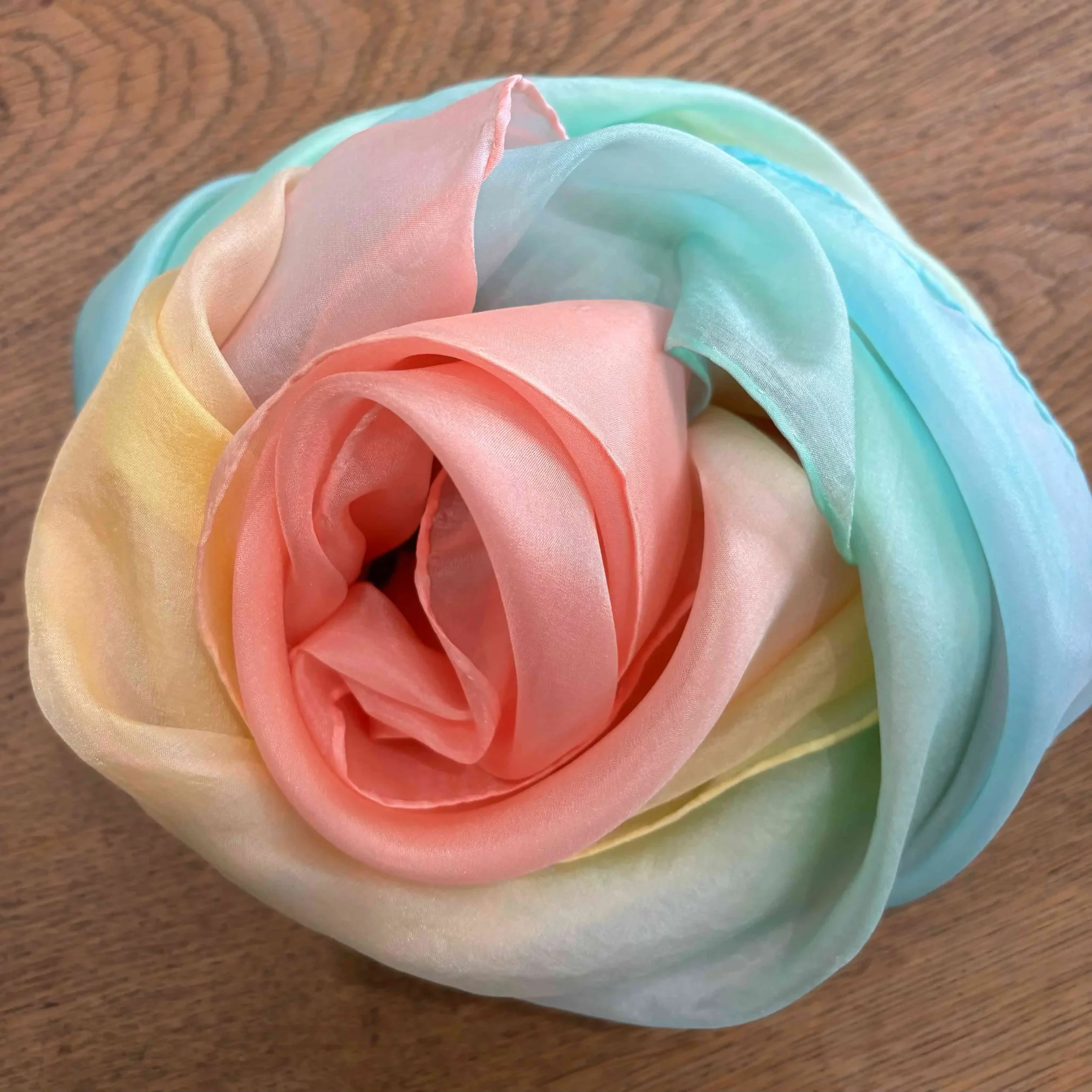 Hand dyed by Birch and Bear for the beauty and wonder of play and imagination.ย ย ย ย ย The beautiful rainbow tones make these silks extra special with each individually unique. 90 x 90cm size and available in pastel or bright tones. *Available also as Fairy-butterfly wings (see Dress-ups)